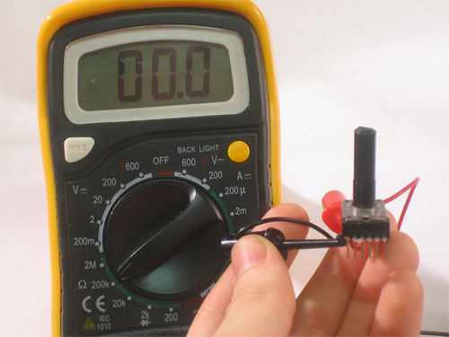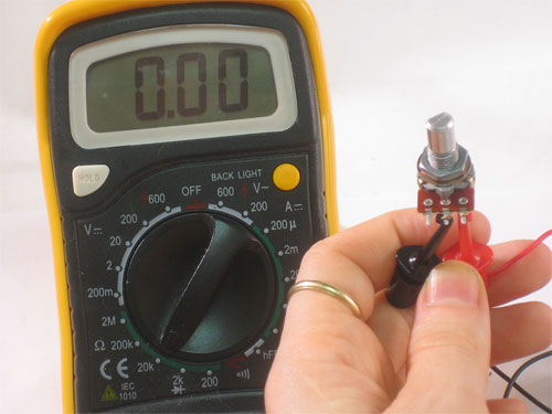 You can also use a multimeter to tell whether the potentiometer is a linear or logarithmic (audio) pot. When the pot is centered, if the resistance between the wiper and one end is half of the total value, its linear. (I used clips instead of probles to make it easier to take these photos)