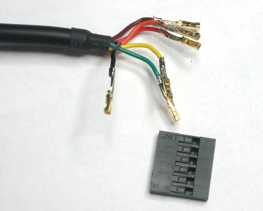 Rearrange the wires as shown, so you have Black (GND) then a space, Orange (TX) and Yellow (RX). You can clip the unused pins or cover them with heatshrink. They wont be used. Just make sure you don't have the conductive pins accidentally touch your Hacker Board!!!