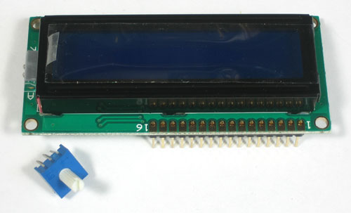 Now we will attach the backpack. We will show how to do this in a permanent fashion. If you think you would like to remove and replace the LCD at some time, you can use a piece of 16-pin long 0.1" female header as a socket but be aware it will stick out a lot.