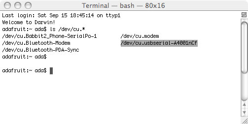The name we are looking for is /dev/cu.usbserial-XXXX where the X's are going to be unique for each cable. Copy and paste the name into a text file so you'll remember it for later.