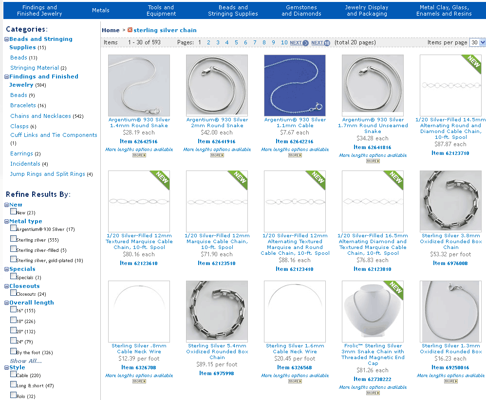 Need a sterling silver chain for your neckace? They've got 600 different chains! You can do some basic drill-down searches to find preciely what you want, and they always have nice big photos!