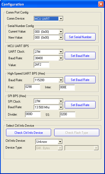 There's only a few other things we suggest doing with this software. One is changing the baud rate. By default the baudrate is 38400 baud. This is a pretty good rate but you can of course change it by going to the Comm Config panel. You want to change tbe MCU UART BPS part - not the High-Speed UART part. Be sure to test the baud rate using your set up after you change it. Its easy to close the COM port and reopen it here rather than wrangling with your microcontroller