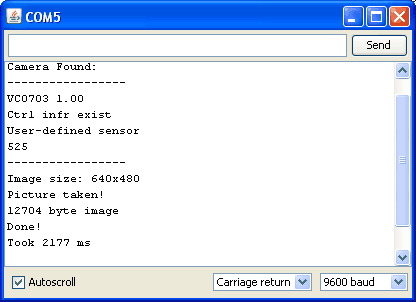 OK now you're finally ready to run the snapshot demo. Open up the Arduino IDE and select File→Examples→Adafruit_VC0706→Snapshot sketch and upload it to the Arduino. Open up the serial monitor and you can see the sketch will take a 640x480 photo and save it to the microSD card. You can then pop the card into your computer to see the JPG file