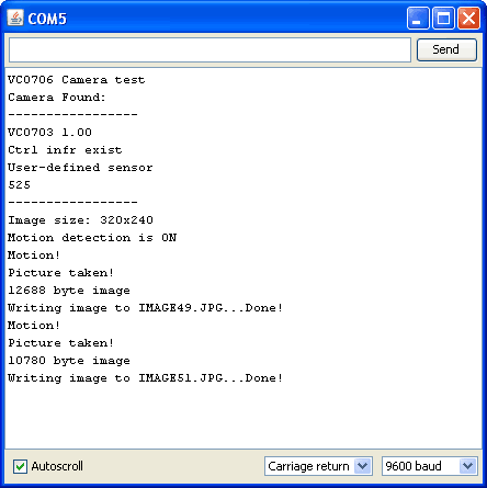 Load up the File→Examples→Adafruit_VC0706→MotionDetect sketch and upload it to the Arduino. It will take a photo immediately because it just turned on. Then wait a few minutes and wave you hand in front of the camera, it will take another photo.