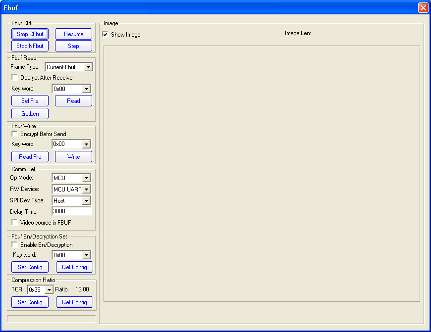 Thats it! You can now easily test reading camera images. To take another photo. Press Resume up at the top to have the video start up again. Then click Stop CFbuf when you want to snap another photo. Finally you can select the Compression Ratio which will improve or degrade the image quality but also change the image transfer time. There's no way to change the image size from this program (easily) but we can do it using the Arduino sketch so just try it out here to start.
