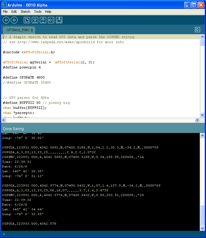 This time, when the GPS module gets a fix, it will parse out the data and display it in slightly more useful format. If you're planning to make locative projects that don't log to the SD card you can stop now. This sketch can provide the backbone of most locative art projects!
