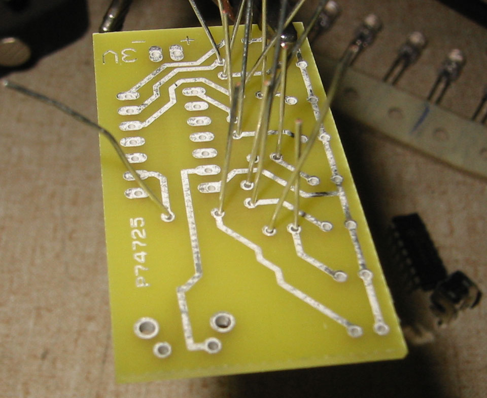 from the top: 8 LEDs, battery holder, 2 batteries, switch, 14-pin