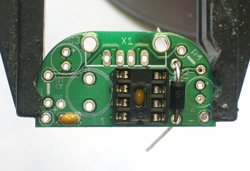 Next is the IC socket. This protects the chip and allows you to replace it if there are any problems. The socket goes over the ceramic capacitor but the capacitor should not interfere as long as it was soldered in properly. Make sure you solder the socket in so that the notch in the edge of the socket matches up with the notch in the silkscreen image of the socket. In this image its near the bottom. If you mess this up, dont try to desolder the socket, instead just keep going and remember that it is upside down later when its time to install the chip |