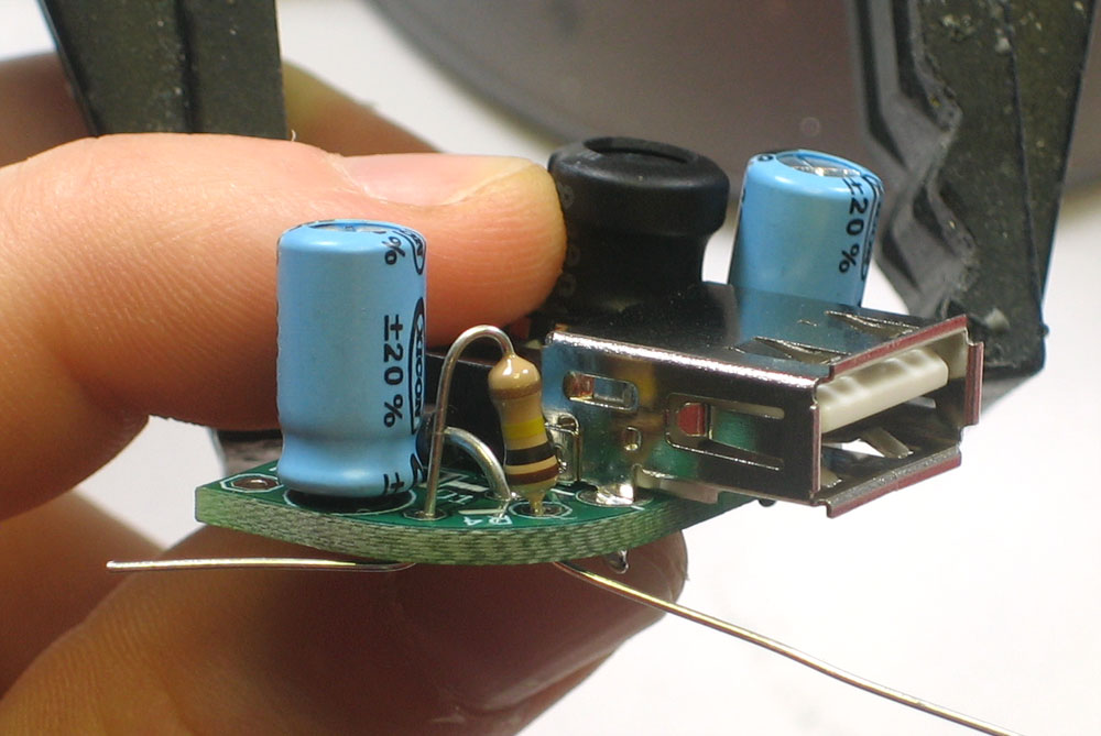 Next it is time to solder in the two resistors that will be used to bias the data lines. This is necessary because many devices use the data lines to indicate whether there is a charger attached or a computer. Since there is no standard every manufacturer uses, there is no guaranteed way to make sure a charger works with every device. However, after some testing, it has been determined that, especially with Apple products such as the iPod/iPhone/iTouch, 2 100K resistors in a 'pull up' configuration seem to do the job. For older devices, 15K was used. Some also like one of the datalines pulled down. We will show how to install the most common configuration and leave it up to you if you'd like to do something else. Bend the two 100K resistors into U shapes. |