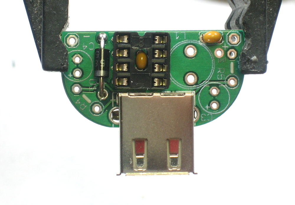 | The second resistor R5 goes in to the left of the USB connector as shown. there are two holes that the wire lead can go thru, one is marked with a line and a small "pu" (pull up) and the other hole is plain and is marked with a small "pd" (pull down). Use the one marked "pu" | |