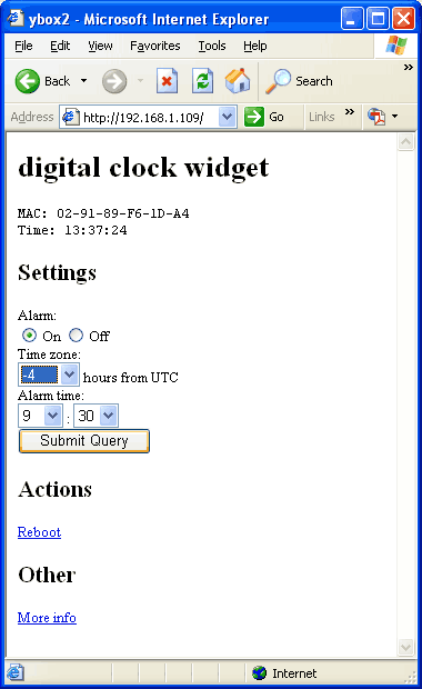 This is the default widget that YBox2 kits come with. It will display the weather for a zip code. You can customize the zip code via the web interface. Please note the infowidget server address is now 72.14.176.143 be sure to update your widget!