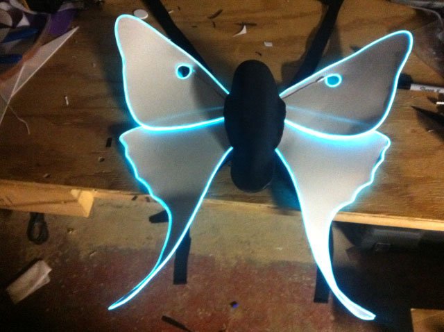 That changed in 2011 when my wife and I decided to celebrate our 10th anniversary by attending Burning Man. Being that it's held in the middle of the desert, it gets really dark out there at night. Because of this it's very important to be lit up so that you're visible to the other people, cyclists and vehicles. So there was my muse - I wanted to make something for my wife that lit up, was easy to wear, and looked cool. How about some EL wire wings?