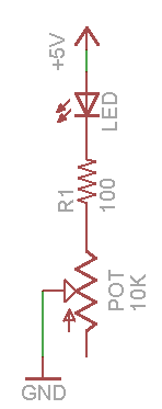 Note that we are connecting to the wiper and one end, not to both ends. Also, we have a 100 ohm resistor between the potentiometer and the LED.