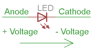 A really nice thing about LEDs is that they are very simple. Unlike some chips that have dozens of pins with names and special uses, LEDs have only two wires. One wire is the anode (positive) and another is the cathode (negative). They two wires have different names because LEDs only work in one direction and we need to keep track of which pin is which. One goes to the positive voltage and the other goes to the negative voltage. Electronic parts that only work in 'one direction' like this are called Diodes, thats what the last letter of LED stands for