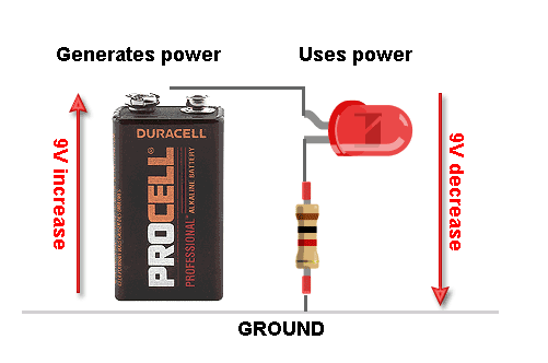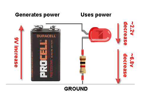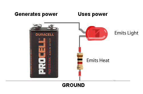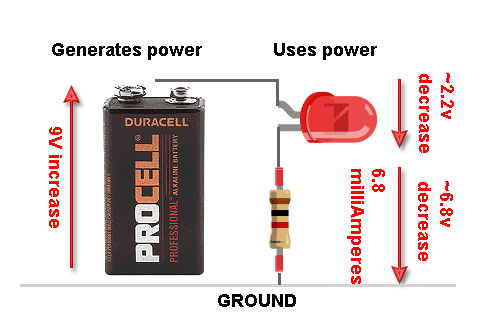 In our three-piece circuit, we have the battery (which generates voltage) and the resistor+LED (which uses up the voltage). I will now tell you a very key 'law' of electronics: