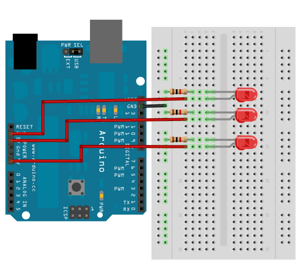 Power up the Arduino and examine how each LED is lit differently. Time for a quick quiz!