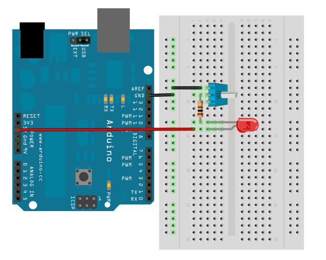 Lets build an LED circuit with a zero ohm resistor (also known as a wire) to Vin so be sure to plug in the Arduino into the wall with a plug-pack/wall-wart. (For somewhat detailed reasons we'll cover in another tutorial, using the 3.3V or 5V power pins won't do what we want, we need to use Vin)