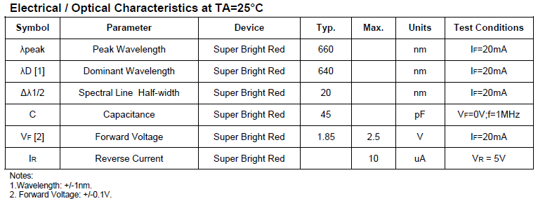 Lets examine the specification sheet for a 5mm LED, specification sheets are also called datasheets. Datasheets are immensly useful, they have all the information you need for an electronic component. You can download the datasheet we'll be referring to here.