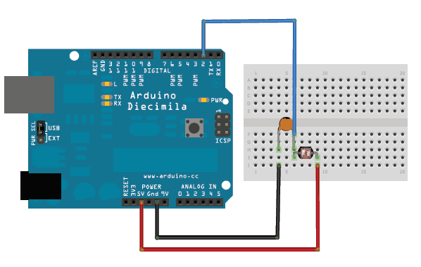 Because photocells are basically resistors, its possible to use them even if you don't have any analog pins on your microcontroller (or if say you want to connect more than you have analog input pins). The way we do this is by taking advantage of a basic electronic property of resistors and capacitors. It turns out that if you take a capacitor that is initially storing no voltage, and then connect it to power (like 5V) through a resistor, it will charge up to the power voltage slowly. The bigger the resistor, the slower it is.