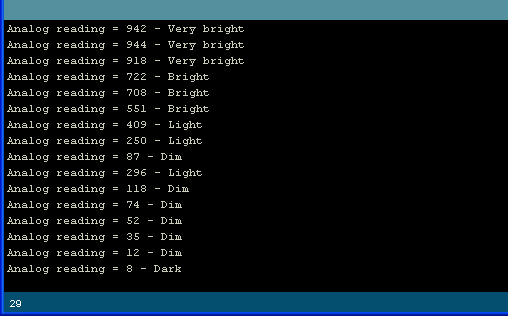/* Photocell simple testing sketch. Connect one end of the photocell to 5V, the other end to Analog 0. Then connect one end of a 10K resistor from Analog 0 to ground For more information see www.ladyada.net/learn/sensors/cds.html */ int photocellPin = 0; // the cell and 10K pulldown are connected to a0 int photocellReading; // the analog reading from the analog resistor divider void setup(void) { // We'll send debugging information via the Serial monitor Serial.begin(9600); } void loop(void) { photocellReading = analogRead(photocellPin); Serial.print("Analog reading = "); Serial.print(photocellReading); // the raw analog reading // We'll have a few threshholds, qualitatively determined if (photocellReading < 10) { Serial.println(" - Dark"); } else if (photocellReading < 200) { Serial.println(" - Dim"); } else if (photocellReading < 500) { Serial.println(" - Light"); } else if (photocellReading < 800) { Serial.println(" - Bright"); } else { Serial.println(" - Very bright"); } delay(1000); }