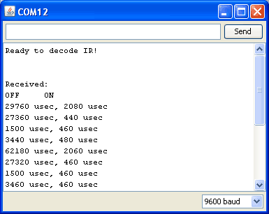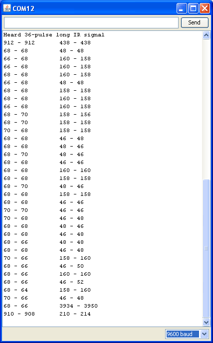 We'll use the code from our previous sketch for raw IR reading but this time we'll edit our printer-outer to have it give us the pulses in a C array, this will make it easier for us to use for pattern matching