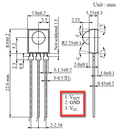 The positive (longer) head of the Red LED connects to the +6V pin and the negative (shorter lead) connects through a 200 to 1000 ohm resistor to the first pin on the IR sensor.