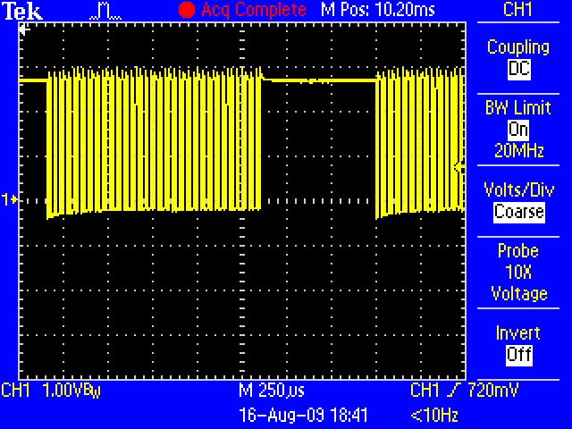 OK so now we can understand how IR codes are sent. The IR transmitter LED is quickly pulsed (PWM - pulse width modulated) at a high frequency of 38KHz and then that PWM is likewise pulsed on and off much slower, at times that are about 1-3 ms long.