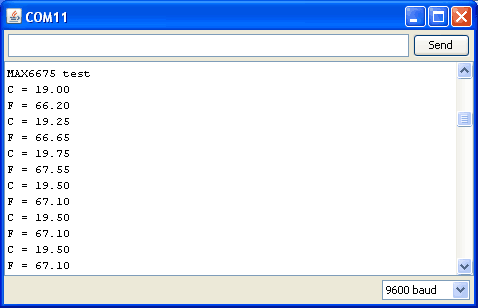 As you can see, its pretty simple to use the library, simply tell the MAX6675 object what the clock, chip select and data pins are, then call readCelsius() or readFarenheit() to get a floating point result. In this example we provide power to the MAX chip via pins 2 and 3 but if you're not just plugging it in as above, you can take out those lines.
