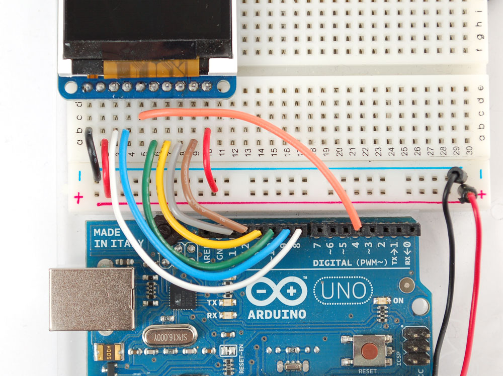 There are two ways to wire up these displays - one is a more flexible method (you can use any pins on the Arduino) and the other is much faster (4-8x faster, but you are required to use the hardware SPI pins) We will begin by showing how to use the more flexible method.