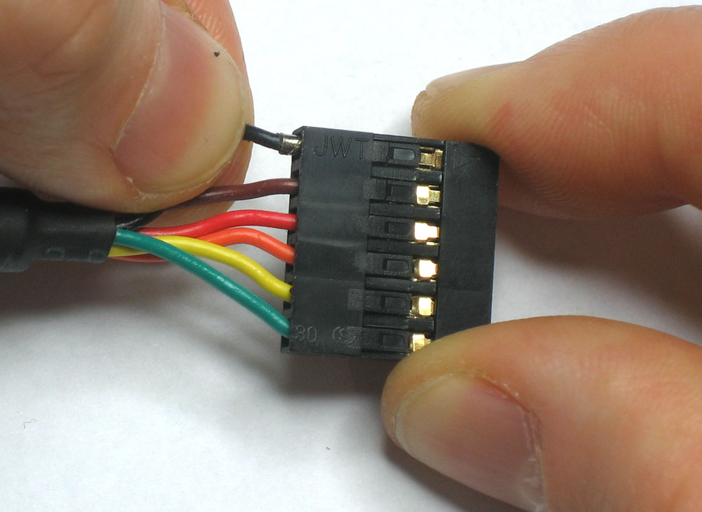 Rearrange the wires as shown, so you have Black (GND) then a space, Orange (TX) and Yellow (RX). You can clip the unused pins or cover them with heatshrink. They wont be used. Just make sure you don't have the conductive pins accidentally touch your Hacker Board!!! :chumby:chumbyftdi.jpg