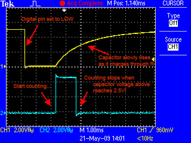 This capture from an oscilloscope shows whats happening on the digital pin (yellow). The blue line indicates when the sketch starts counting and when the couting is complete, about 1.2ms later.