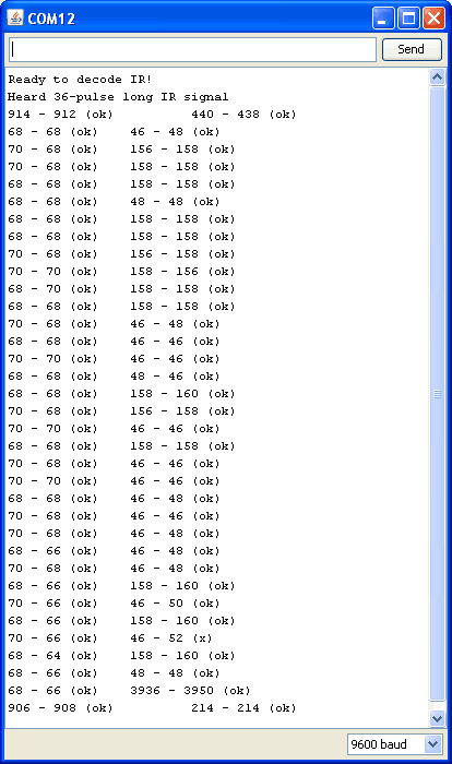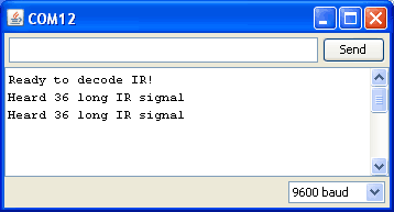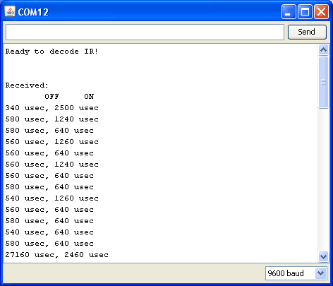 We'll use the code from our previous sketch for raw IR reading but this time we'll edit our printer-outer to have it give us the pulses in a C array, this will make it easier for us to use for pattern matching
