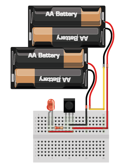 We will use 4xAA 1.5V batteries so that the voltage powering the sensor is about 6V. 2 batteries (3V) is too little. You can also get 5V from a microcontroller like an Arduino if you have one around. Ground goes to the middle pin.