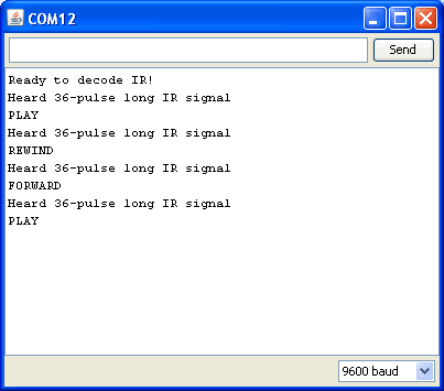 void loop(void) { int numberpulses; numberpulses = listenForIR(); Serial.print("Heard "); Serial.print(numberpulses); Serial.println("-pulse long IR signal"); if (IRcompare(numberpulses, ApplePlaySignal)) { Serial.println("PLAY"); } if (IRcompare(numberpulses, AppleRewindSignal)) { Serial.println("REWIND"); } if (IRcompare(numberpulses, AppleForwardSignal)) { Serial.println("FORWARD"); } }