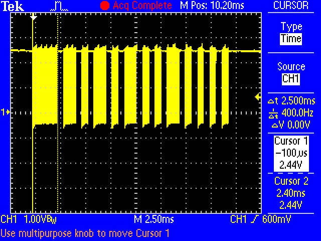 The first pulse is 2.5ms. We can use the cursors to measure the remaining pulses. I'll spare you the 12 images and let you know that the pulses are: