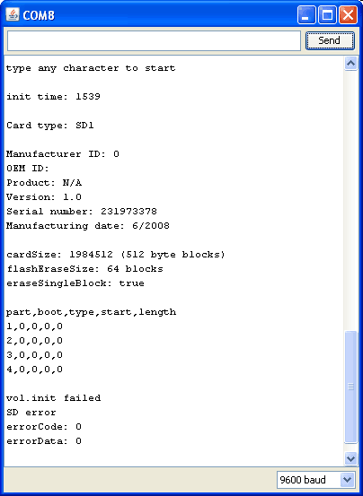 The card mostly responded, but the data is all bad. Note that the Product ID is "N/A" and there is no Manufacturer ID or OEM ID. This card returned some SD errors. Its basically a bad scene, I only keep this card around to use as an example of a bad card! If you get something like this (where there is a response but its corrupted) you can try to reformat it or if it still flakes out, should toss the card