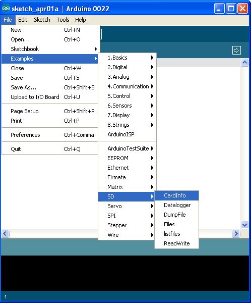 Interfacing with an SD card is a bunch of work, but luckily for us, Adafruit customer fat16lib (William G) has written a very nice Arduino library just for this purpose and its now part of the Arduino IDE known as SD (pretty good name, right?)