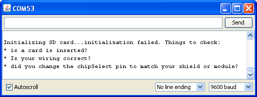 Finally, try taking out the SD card and running the sketch again, you'll get the following,