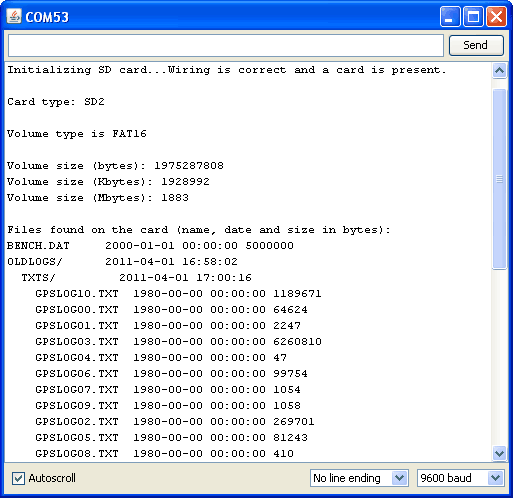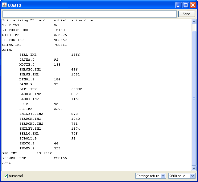 Here you can see that we have a subdirectory ANIM (we have animation files in it). The numbers after each file name are the size in bytes of the file. This sketch is handy if you want to check what files are called on your card. The sketch also demonstrates how to do directory handling