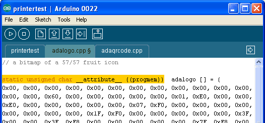 You can now include it into your sketch. We like to make a new tab (the right arrow in the Arduino IDE bar) and save the image data in there. Then in your main sketch be sure to #include "tablename.cpp" where tablename is what you saved it in the tab. Check the printertest example sketch if you're not sure how to include the code properly.