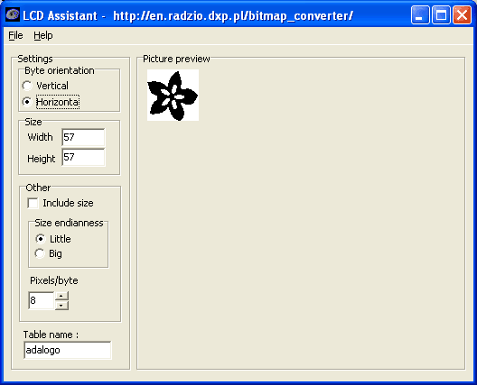 Then start up LCD Assistant which is windows only but does a really fantastic job!Load in the BMP you generated