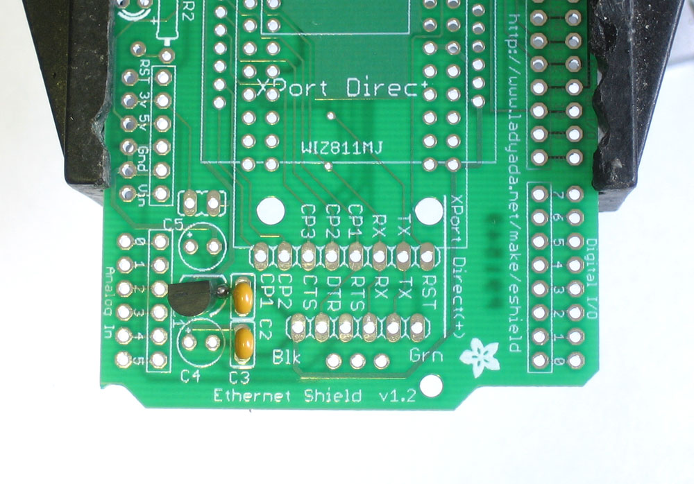 This step assumes you want to use an XPort Direct or Direct+ With the XPort plugged into the headers, place it on the shield and tack the four corners with a small amount of solder. This is to keep the headers spaced properly. |