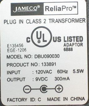 ![]() | 9V DC power plug with 2.1mm barrel plug, positive tip Optional | Adafruit Any electronics supply store (Best Buy, Radio Shack, etc.) $10 |