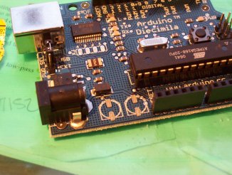 OK, now that you are satisfied that your Arduino looks good, put the rubber bumpers on the bottom of the board. This will protect your Arduino from spills and dirty tables. If your table is made out of metal, this is essential!