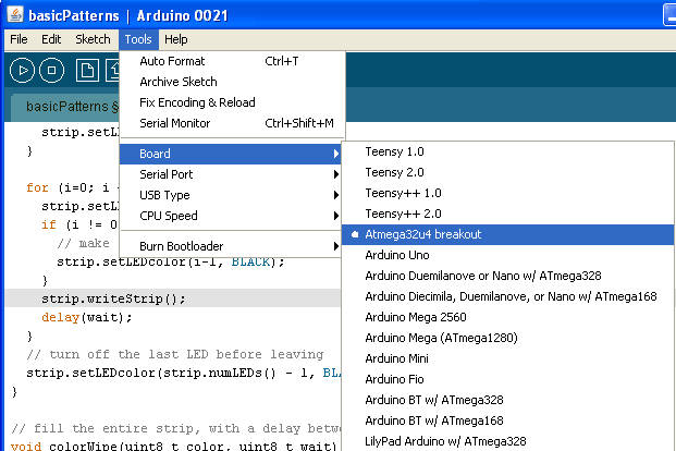 We'll have to install the Arduino IDE and modify it so that we can use it with this chip. To do this, please visit our detailed instruction page on installing teensyduino and modifying it so it works with the 32u4 board.