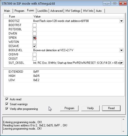 Fuses settings for the AVR ATmega168V in AVR-Studio: